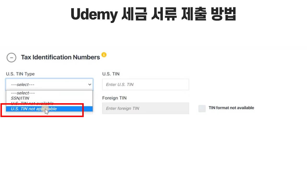 일단 여기서는 우린 미국에 TIN이 없기 때문에 "US TIN not applicabe"를 선택하세요.