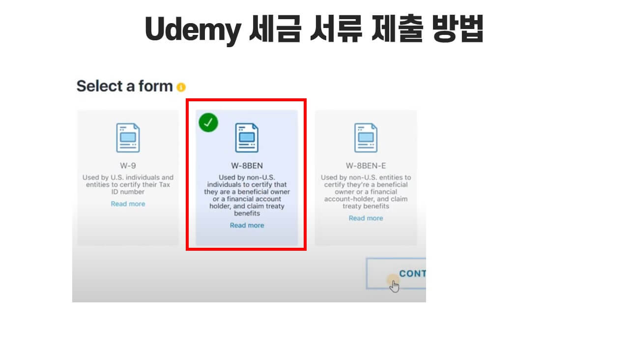 앞쪽에서 미국 외로 선택했으면 자연스럽게 "W-8BEN" 메뉴만 활성화가 됩니다. 자세히 보면 미국이 아닌 개인들이 모두 이 형식인 것 같습니다. 아무튼 가볍게 선택하시고 "Continue"를 눌러주세요.