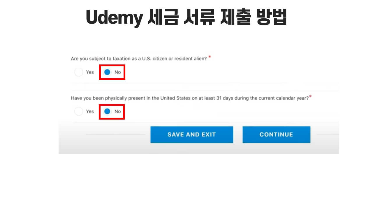 마찬가지로 미국의 세금 내지 않을 것이기에 가볍게 "NO"를 선택하고, "Continue"를 눌러주세요.