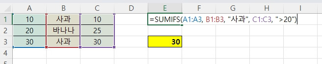 수식: =SUMIFS(A1:A3, B1:B3, "사과", C1:C3, ">20")