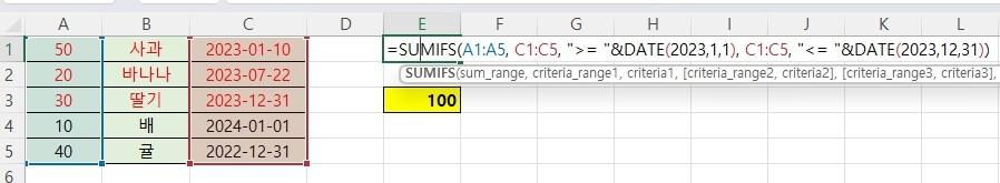수식: =SUMIFS(A1:A5, C1:C5, ">= "&DATE(2023,1,1), C1:C5, "<= "&DATE(2023,12,31))