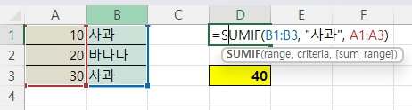수식: =SUMIF(B1:B3, "사과", A1:A3)