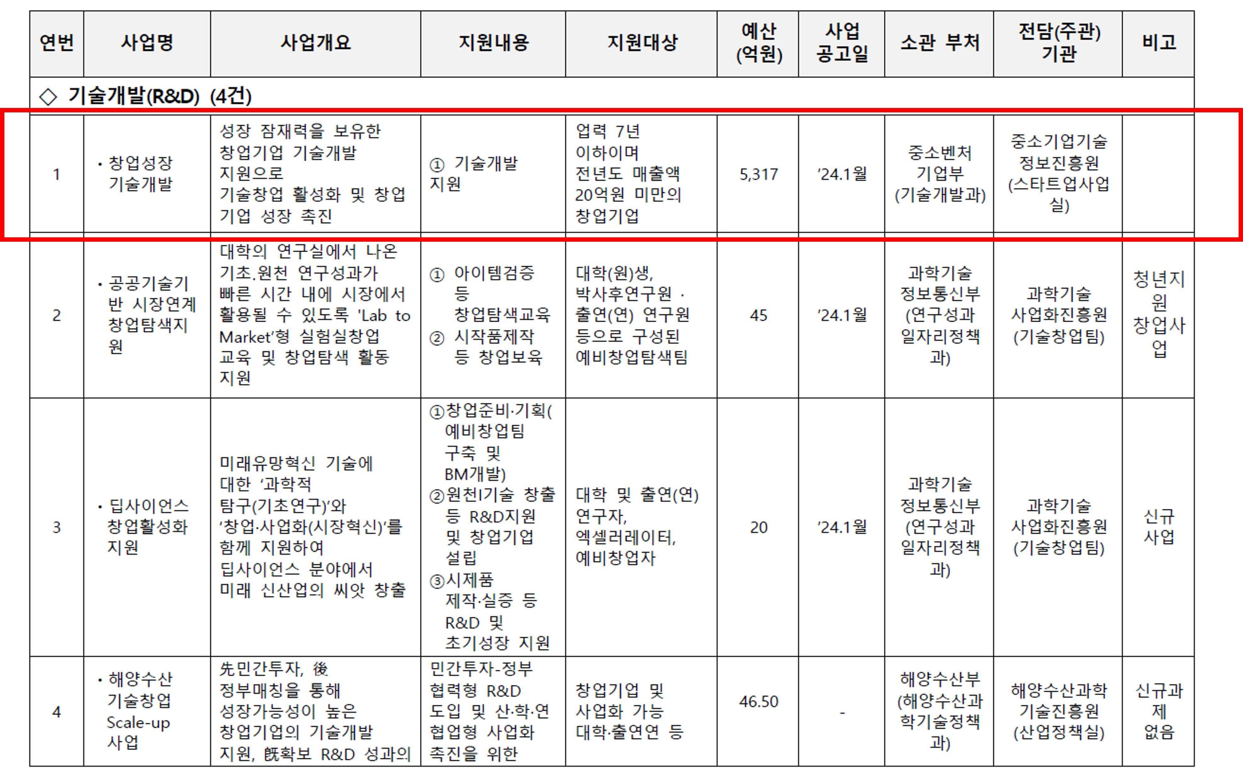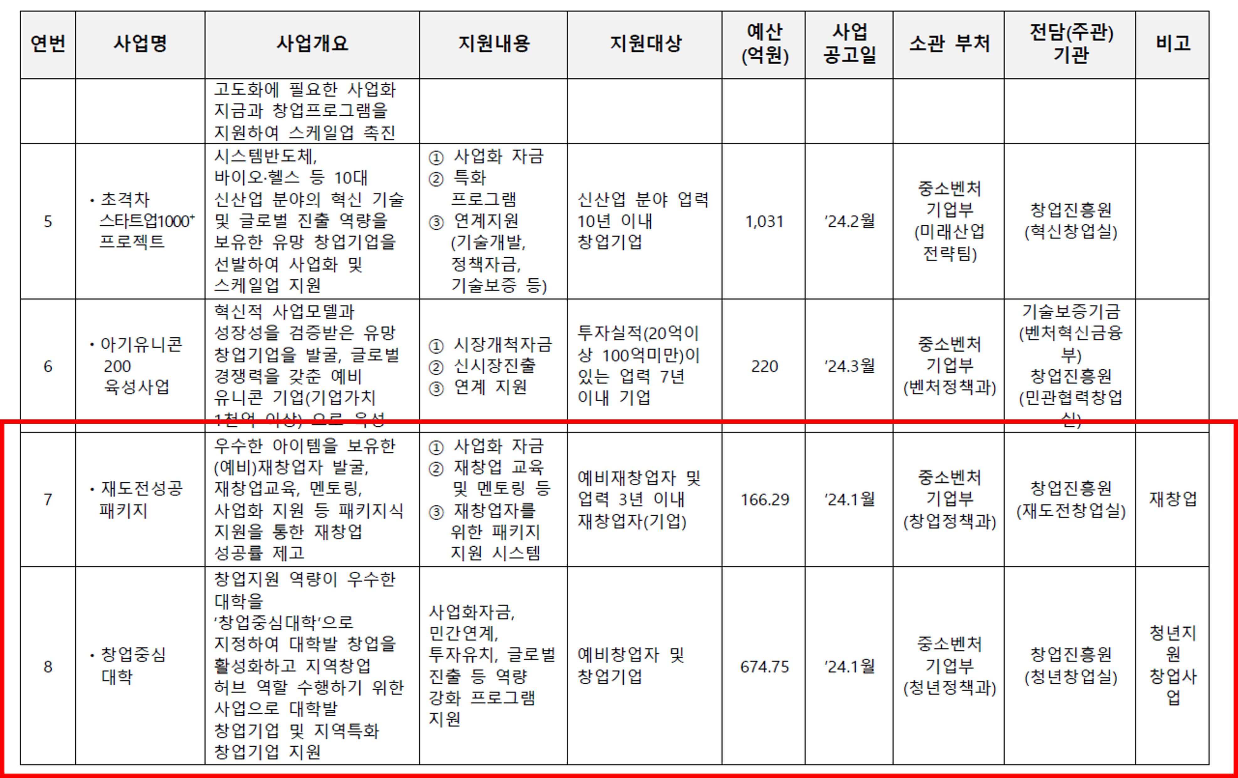 아래 표를 보시면 아시겠지만, 23년도 대비 24년도의 창업지원사업의 전체 예산은 증가하였습니다.