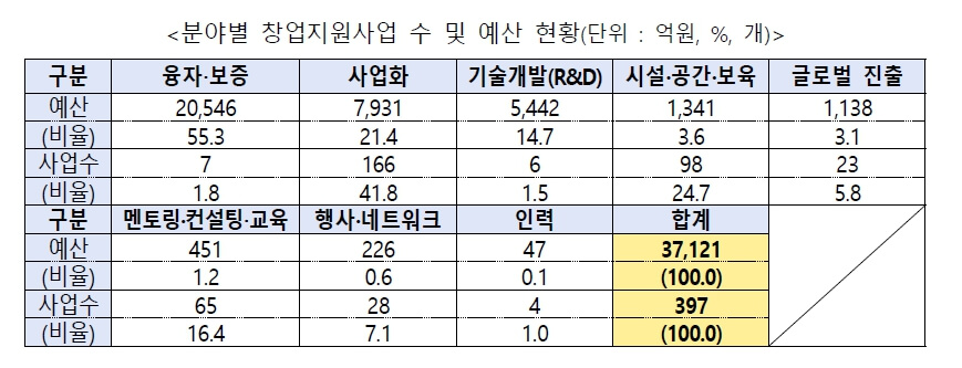 분야별로 살펴보면, 융자‧보증(2조 546억원, 7개), 사업화(7,931억원, 166개), 기술개발(5,442억원, 6개), 시설·공간·보육(1,341억원, 98개), 글로벌 진출(1,138억원, 23개) 등으로 구성되어 있습니다.