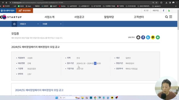 창업 기업들이 가장 선호하고 가장 많이 지원하는 예비창업패키지 공고문을 살펴보겠습니다. 들어가시면 일단 접수 기간은 오늘 1월 30일부터 공고가 된 다음에 2월 21일까지 접수가 되죠. 그런데 우리가 이제 마감일이 다가오니 접수하기가 좀 어려워요. 그렇기 때문에 꼭 20일까지 여러분들이 지원을 하시는 것을 추천드릴게요. 이번에는 명절이 껴있죠. 명절이 껴 있어서 준비할 시간이 많이 없는데 한 가지 다행인 것은 2023년도에 지원하셨다 떨어진 분이라거나 아니면 미리 준비하신 분들은 양식이 변화가 별로 없어요. 그렇기 때문에 충분히 추천 가능할 거라고 생각이 듭니다.
