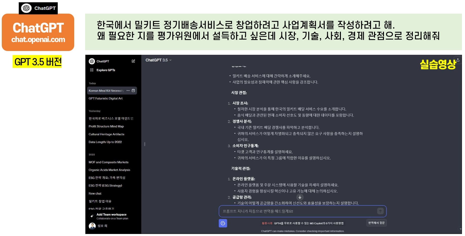 | [무료강의] ChatGPT 사업계획서 작성하기 : 문제인식(1-1 창업아이템 배경 및 필요성)(2) (1) | 2024.03.06 |