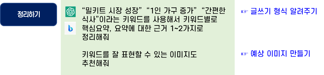 핵심 키워드를 뽑았으면, ChatGPT와 BingChat에게 다시 정리 작업을 시키자. 명령할 때는 글쓰기 형식도 알려주고, 나중에 활용할 예상 이미지도 추천받아 보자.