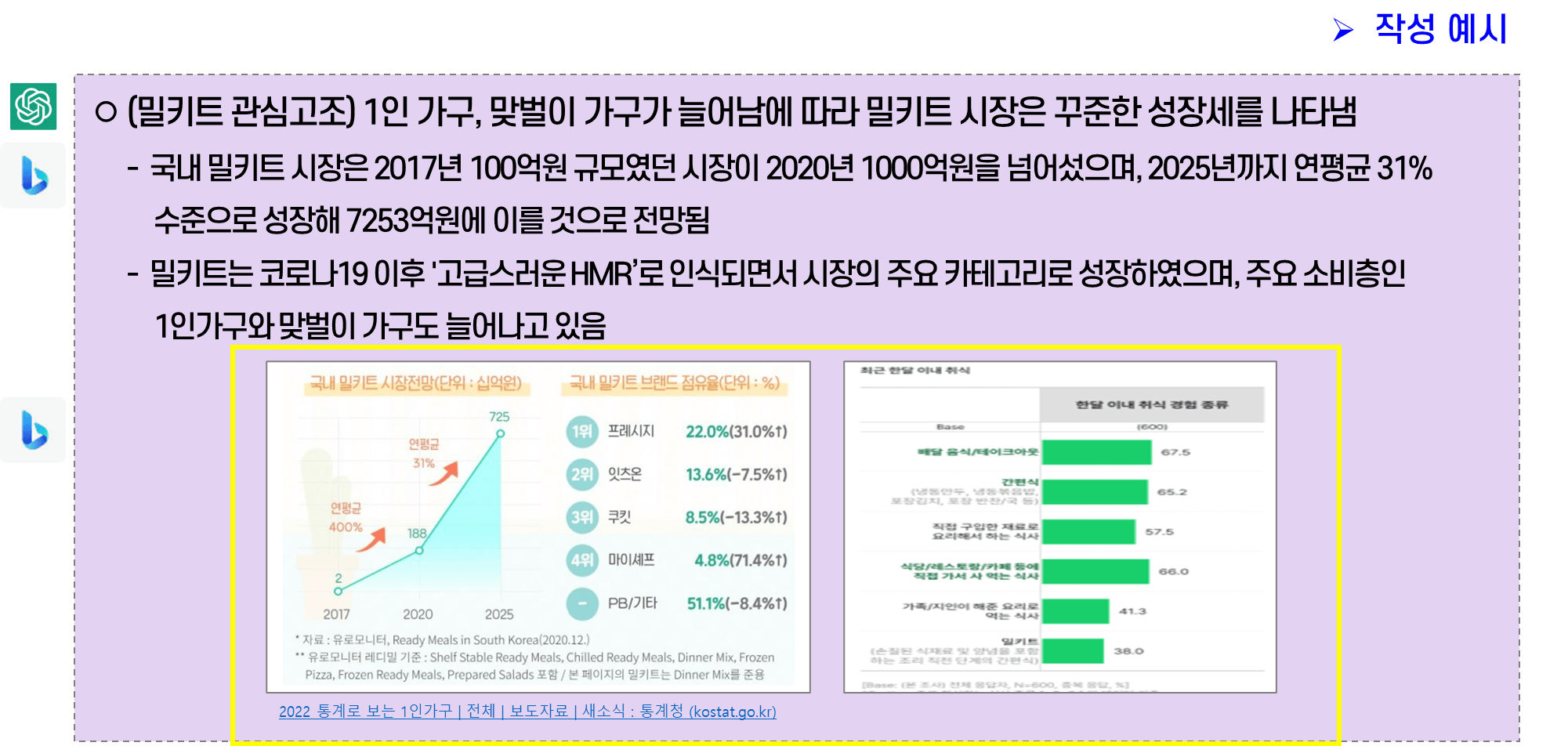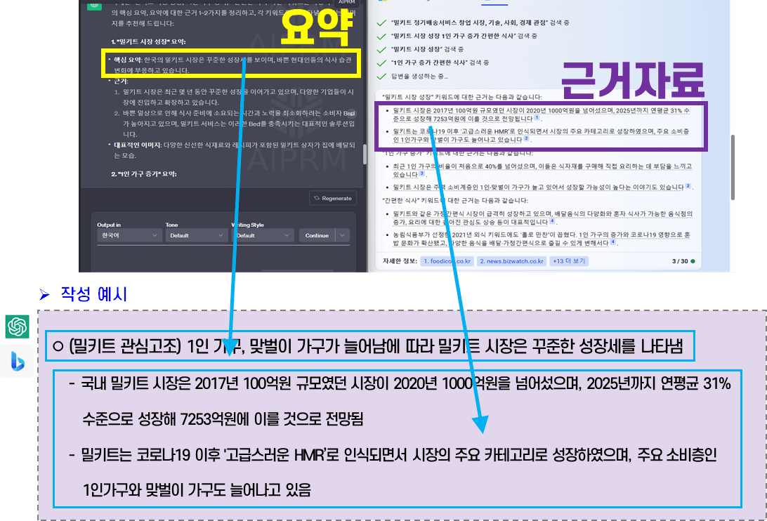 사업계획서 작성을 위한 내용을 가져올 때는 ChatGPT에서는 “핵심요약” 내용으로, BingChat에서는 “근거자료”를 설명하는 내용으로 가져오면 된다. 아직 사람이 작성하는 것처럼 매끄럽지는 않기 때문에 사람이 글을 다듬어주고, 틀린 부분은 수정해서 가져오자.