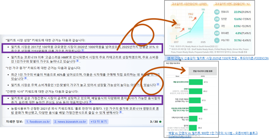 리스트 중에서 2~3가지 정도의 키워드를 선정하자. 이건 사람이 할 역할이다. 필자는 “밀키트시장 성장”, “1인 가구 증가”, “간편한 식사” 3가지를 핵심 키워드로 선정하였다.