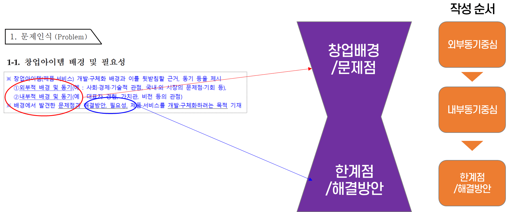 작성가이드 내용을 가지고 우리가 어떻게 작성해야 하는지 정리해 보면 크게 2단계로 구분된다. 첫 번째는 창업배경/문제점, 두 번째는 한계점/해결방안이다.