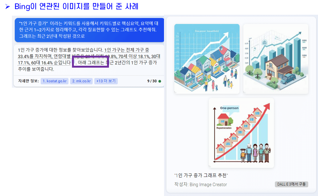 이제 문장은 완성했는데 어딘지 모르게 허전함이 있다. 바로 이미지나 차트와 같은 시각화 자료가 없어서이다. 이 문제는 BingChat에서 출처에 들어가 관련된 시각화 자료를 찾을 수 있다.