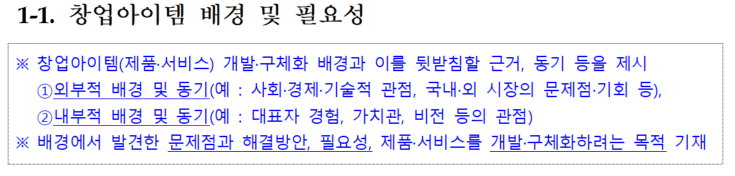 “1-1. 창업아이템 배경 및 필요성”에서는 제품(서비스)을(서비스) 구체화가 필요한 이유, 현재 주요 문제점 및 기회 등(시장의 관점, 창업자 관점 등을 포함)을 작성하고 창업자(팀원)의 경험을 기반으로 사업의 주된 목적, 해결 시 기대효과 등을 작성해야 한다. 한마디로 말하면 “내 창업아이템은 OOO 이유로 필요하다.”를 보여달라는 것이다.