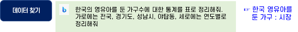 여기서는 수치(데이터)를 찾는 것이 중요하다. 그래서 ChatGPT보다 BingChat이 유용하다. BingChat에게 명령을 해보자. 명령을 할 때는 내 고객을 잘 나타낼 수 있는 데이터를 지목해야 한다. 실습용 아이템은 “영유아를 둔 주부”이고 “국내시장”을 한정하였다.
