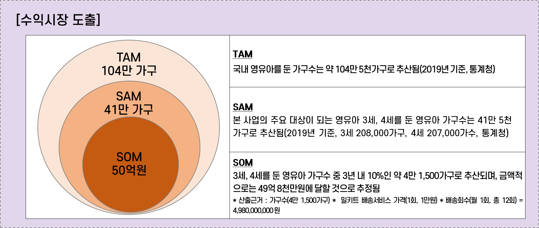 수익시장(SOM)은 3세, 4세를 둔 가구수 중에서 10%로 가정하였다.