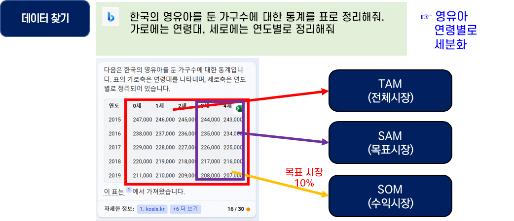 그래서 “한국의 영유아를 둔 가구수”를 찾아 달라고 하였다. 이때 전체시장(TAM)은 전국이 되고, 목표시장(SAM)은 경기도가 되고, 수익시장(SOM)은 성남시라고 가정하였다.