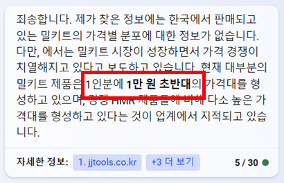 하지만, BingChat도 정확한 금액을 말해주지 않고, 대략 “1인분에 1만원 초반대”라고만 답하였다. 이 정도의 데이터만으로도 충분하다.