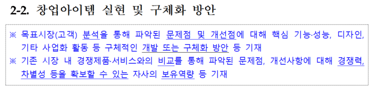 아래 그림은 실제 예비창업패키지 사업계획서 작성양식에 있는 작성 가이드(파란색) 내용이다.