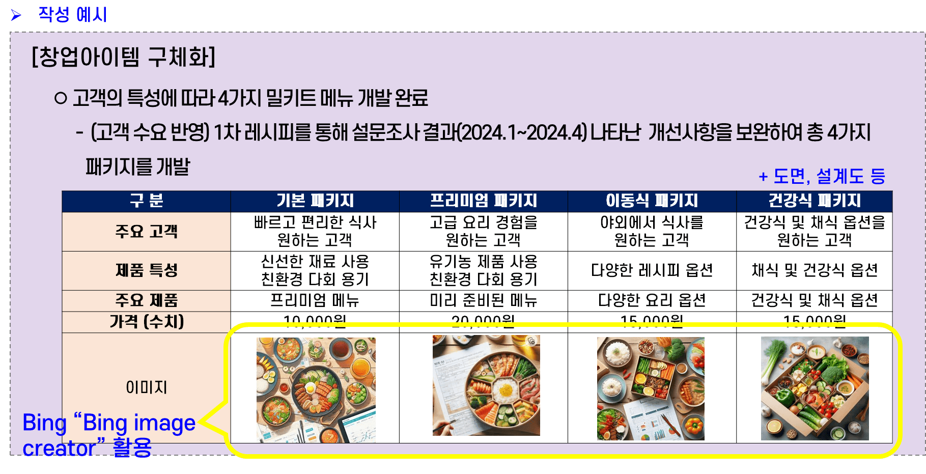 제품군은 기본 패키지, 프리미엄 패키지, 이동식 패키지, 건강식 패키지로 구분하였고, 각 상품별로의 타깃 고객과 특성, 가격까지 결정하였다. 또한, 예상된 산출물 이미지까지 언급하였다. 이렇게 작성하면 평가위원은 “창업아이템이 구체적으로 설계되었구나. 선정되면 바로 제품화가 가능하겠어 !” 라고 판단할 것이다. 만약 산출물 이미지가 없다면, 앞서 보여준 “Bing image creator”를 활용하는 것도 방법이다.