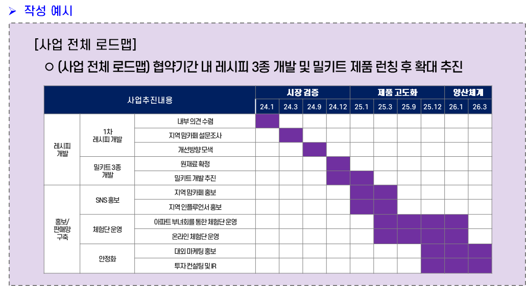 이 파트는 추진 일정을 협약기간내로 한정하여 작성하라는 파트이다. 앞서 사업 전체 로드맵과 연계해서 작성하면 된다.