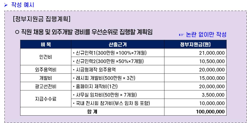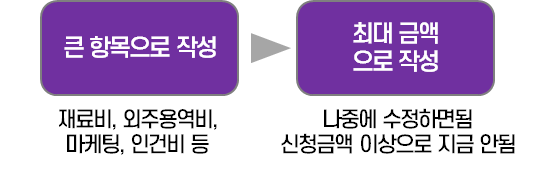 작성할 때 비목은 사업계획서 양식에 나와있는 비목으로 작성하면 무리는 없다. 다만, 외주용역비를 100% 주거나, 인건비를 100% 주는 등 논란 없이만 작성하면 된다.