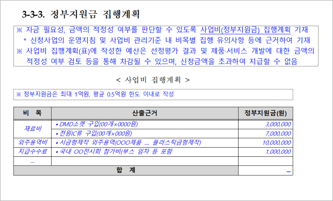 작성 가이드에 평균 0.5억원 한도 이내로 작성하라는 문구가 있는데 이건 무시하자. 내가 좋은 점수를 받아 11억 원을 받는다고 했을 때 내 신청금액이 0.5억이면 그 이상 주지 않는다. 즉, 내가 신청한 금액 이하로만 주니 그냥 최대 금액인 11억 원을 기준으로 사업비를 작성하자.