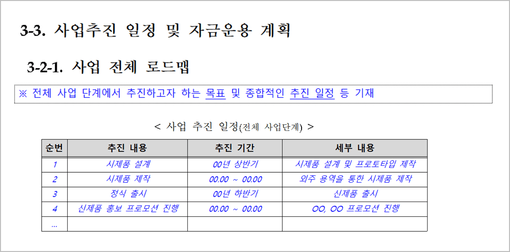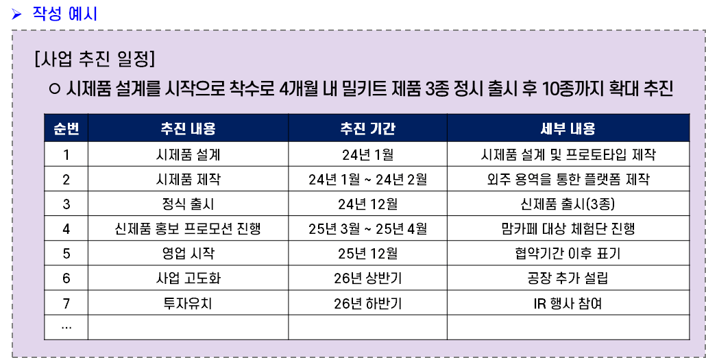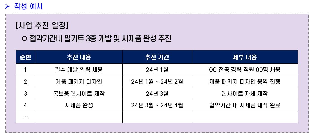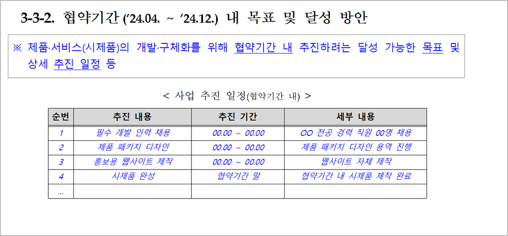 아래 작성 사례는 사업계획서 양식에서 나온 표를 그대로 준용하여 만든 것이다. 사실 이정도만 만들어도 충분하다. 다만, 여기서 말하는 추진 일정은 “협약기간 내”가 아니라 “내 사업“ 전체 일정을 말한다. “협약기간내” 추진일정은 뒤쪽에 따로 작성하는 파트가 있다.
