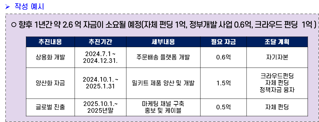 이 파트는 예비창업패키지 지원금 외 자금 활용처와 조달계획을 작성하면 된다. 사실 자금조달 경로나 자금 활용처는 정해져 있으니 아래 사례의 항목으로 활용해 가공해도 큰 무리는 없다.
