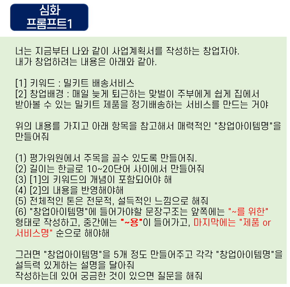 이번 포스팅은 "합격률을 높이는 아이템명 추천받기"입니다. 쳇GPT(chat gpt), 빙쳇(Bing Chat)을 활용한 정부지원사업 사업계획서 작성 방법 에 대한 많은 관심으로 온라인, 오프라인 강의를 진행하고 있습니다. 생각보다 많은 분들이 관심을 보이셨는데 블로그를 방문하시는 분들에게도 도움이 되고자, 집에서 순차적으로 실습을 할 수 있도록 각 목차별로 포스팅을 하고 있습니다.