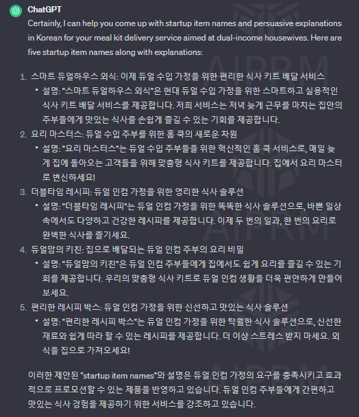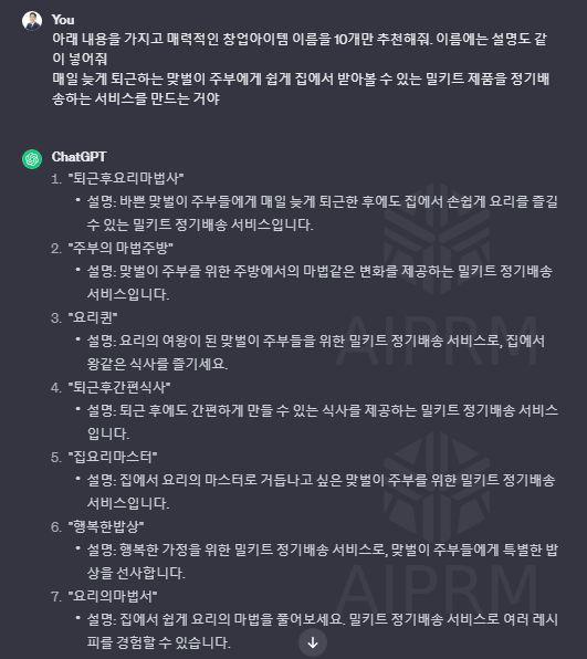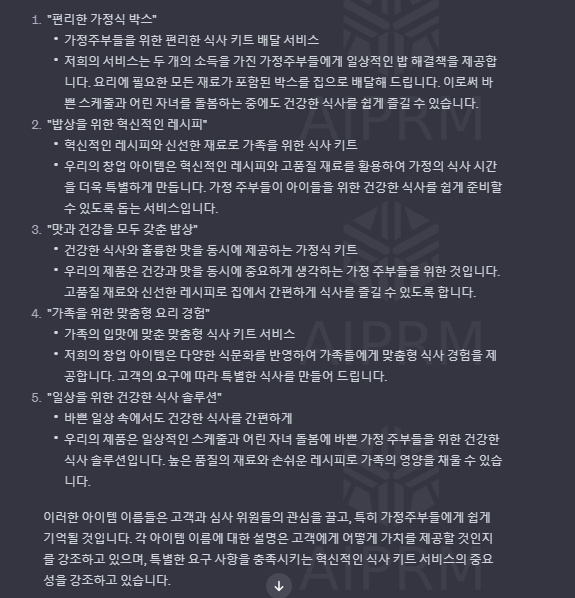 우선 나의 창업아이템을 간략하게 알려주면서 GPT에서 창업아이템 이름을 추천받아 보자.