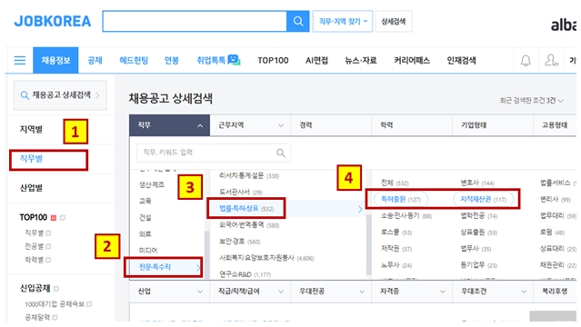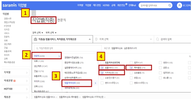 [직업별] → [전문직] → [법률‧특허‧상표] → [법률서비스] + [특허출원] + [지식서비스] 순으로 선택하면 채용정보를 확인할 수 있습니다.