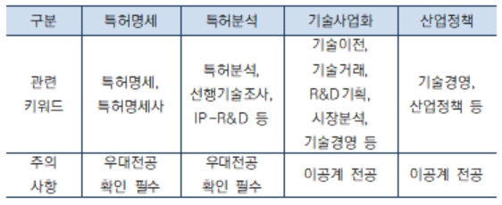 기술거래, R&D기획 등의 키워드를 입력하면 됩니다. 전공에 제약은 없으나 공학 관련 전공자가 유리합니다.