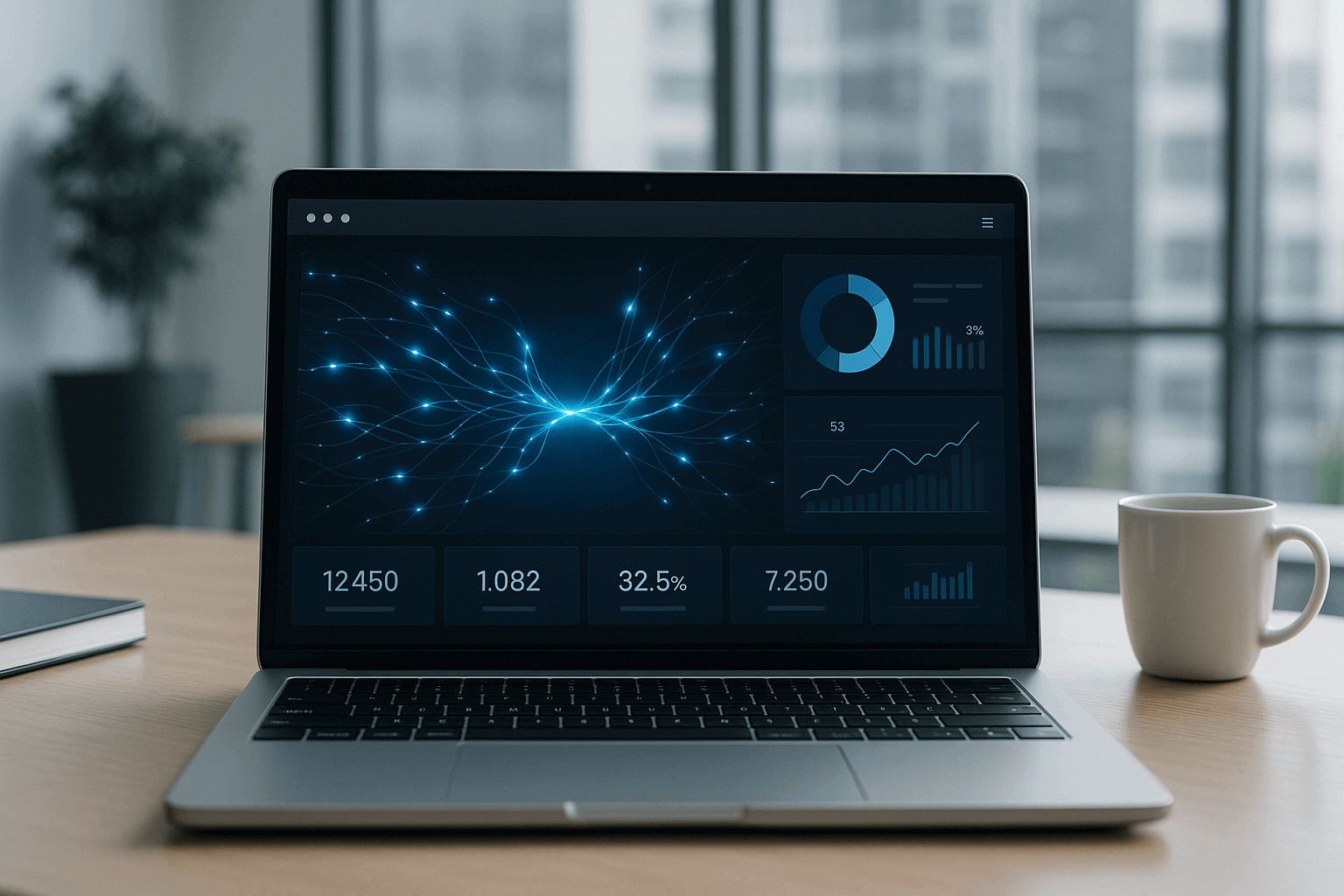 - [AI/SaaS] (결과물) A clean, minimalist dashboard UI, (기술 시각화) showing real-time data analysis flow with glowing blue neural connections, (환경) on a corporate laptop in a modern office. Photorealistic, 16:9 ratio.