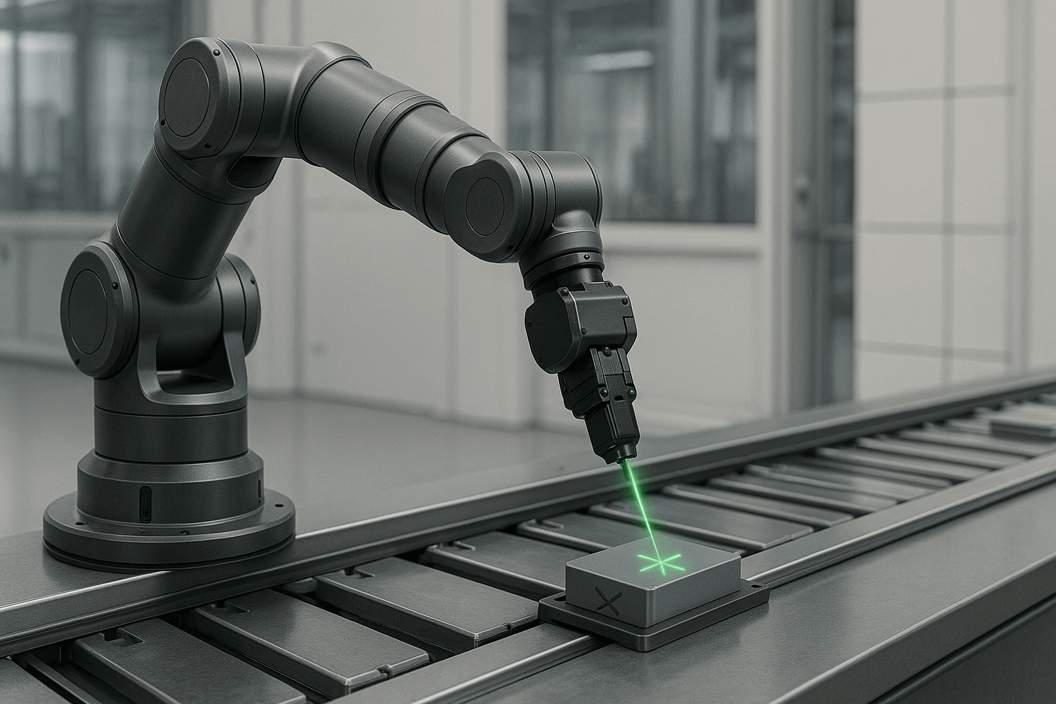 - [하드웨어/제조] (결과물) A sleek, modular robotics arm, (기술 시각화) with precise green laser guidance correcting an error on an assembly line, (환경) inside a clean factory setting. High detail, 3D rendering.