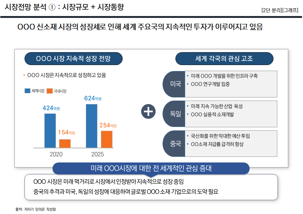 그래서 이런 경우 장표 1페이지를 시장규모 등의 시장 데이터만으로 구성하지 않고