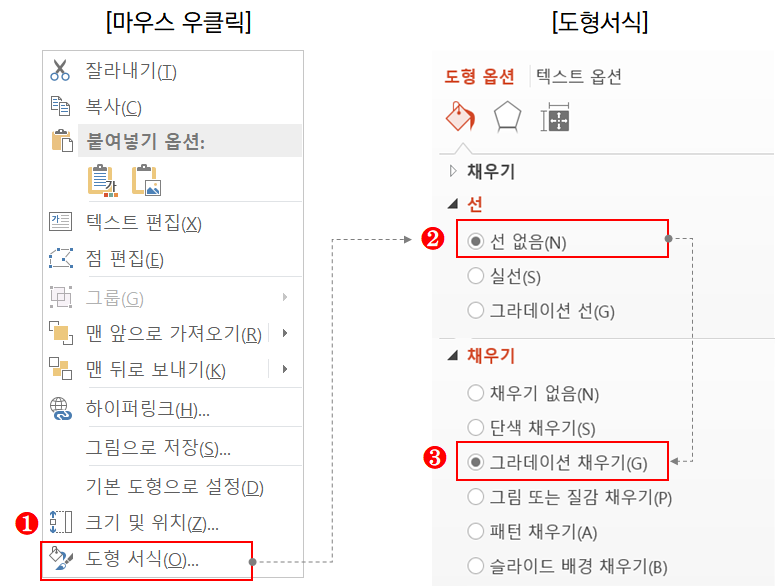 ④ 완성된 도형을 마우스 우 클릭 후 [도형 서식]→[선]→[선 없음], [채우기]→[그라데이션 채우기]을 선택합니다.