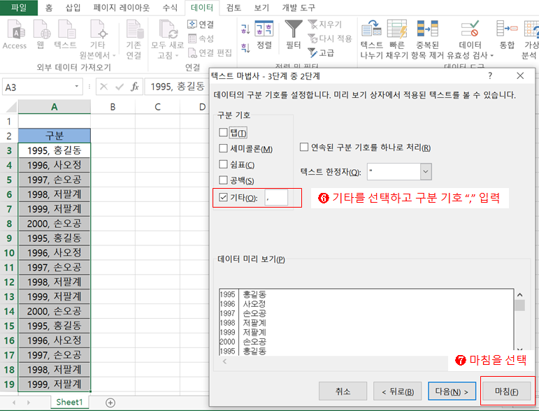 ❻ 구분 기호에서 기타를 선택하고 구분기호인 “,”를 입력한다.
