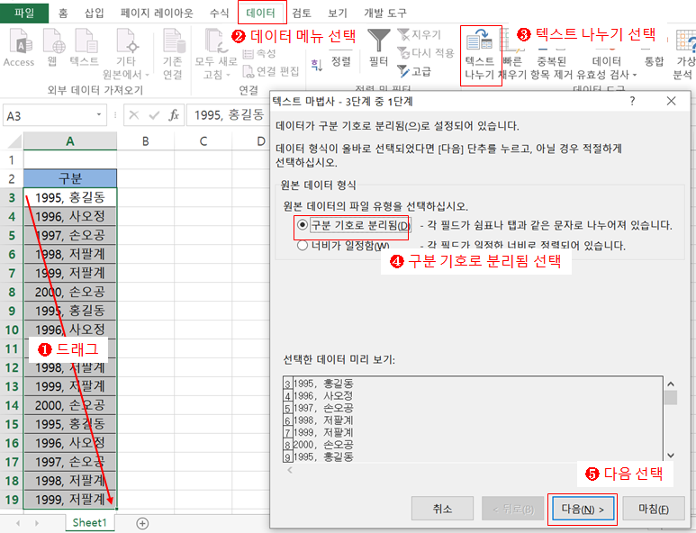 ❶ 정비할 데이터를 선택한다. ❷ 전체 메뉴에서 데이터 선택, ❸ 텍스트 나누기를 선택한다.