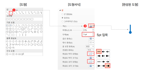 ❶ [도형] → [선]을 선택하여 적당한 크기로 만든다. 만들어진 선을 선택하고 ❷ [서식] → [도형윤곽선] → [화살표] → [다른 화살표] 을 선택하고 [색] 파랑색, [두께] 5pt, [머리유형] 화살표 없음, [꼬리유형] 타원 화살표를 선택한다.