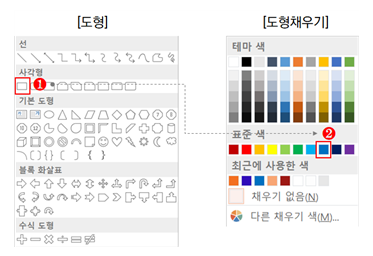 ❷ 만들어진 도형을 선택하고 [서식] → [도형채우기]을 선택하고 [파랑색]을 선택한다.