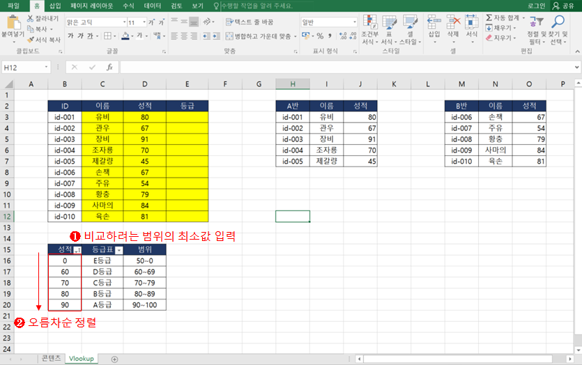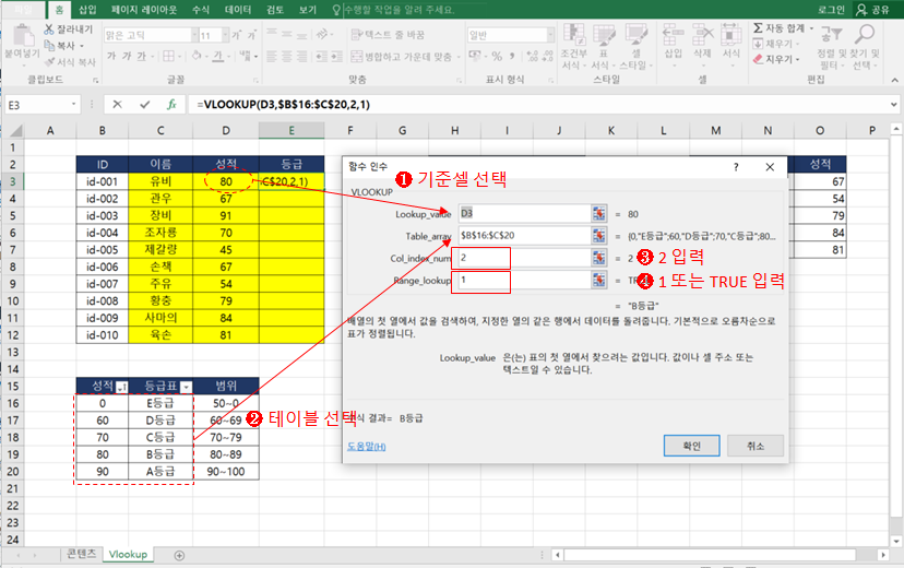 VLOOKUP함수 옵션(True 기능 활용) 활용하여 등급 부여하기