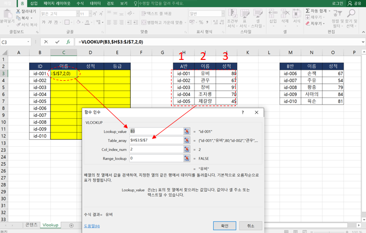 ③ Col_index_num : [ID]로 [이름]을 가져와야 하기 때문에 [이름]이 오른쪽 2번째에 있으니 2를 입력하면 됩니다.