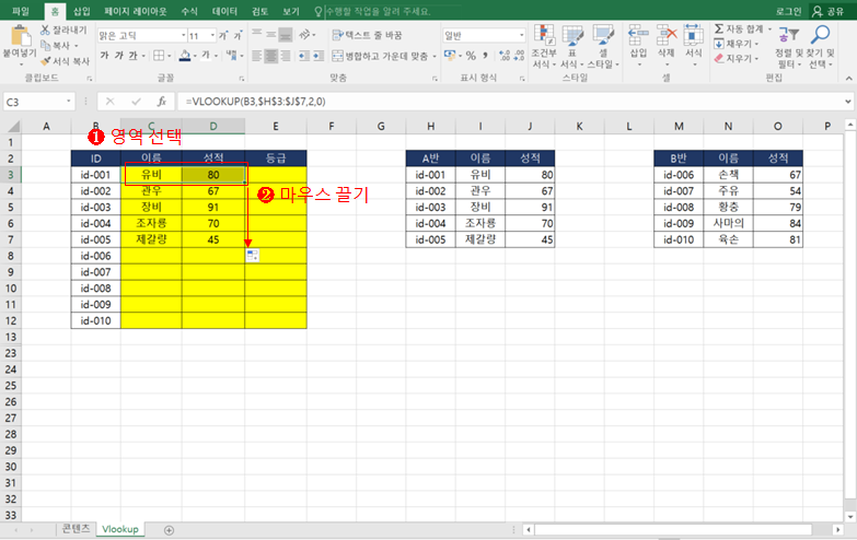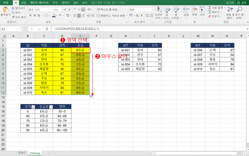 2021.07.14 - [보고서 작성기술/엑셀] - 엑셀 VLOOKUP 함수로 원하는 데이터 가져오기, 등급 부여하기