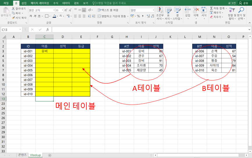 아래와 같이 [A테이블]과 [B테이블]의 데이터에서 "이름"과 "성적" 데이터를 [메인테이블]로 가져온다고 해봅시다.