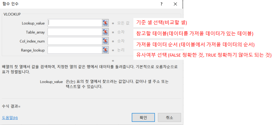 엑셀에서 [함수 삽입]을 누른 후 [VLOOKUP]을 선택 아래와 같은 창이 뜹니다.