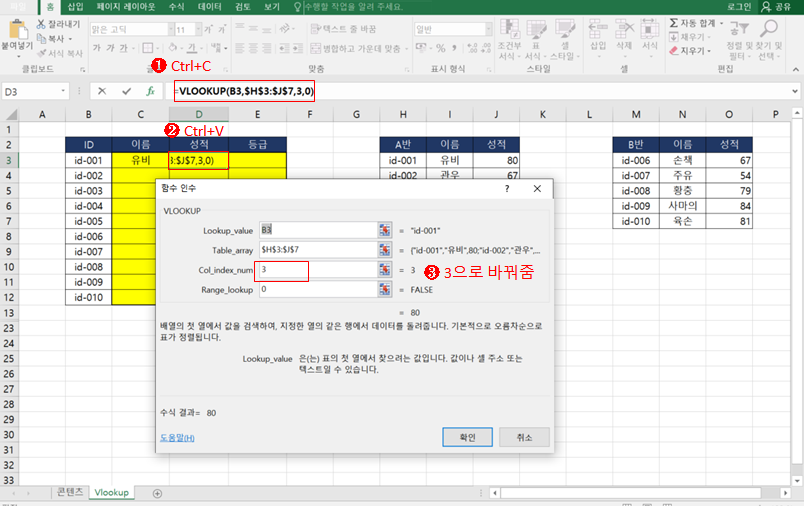 ③ 복사를 했다면 Col_index_num를 3으로 바꿔주십시오.. 왜냐면 [성적] 데이터는 3번째에 있기 때문입니다.