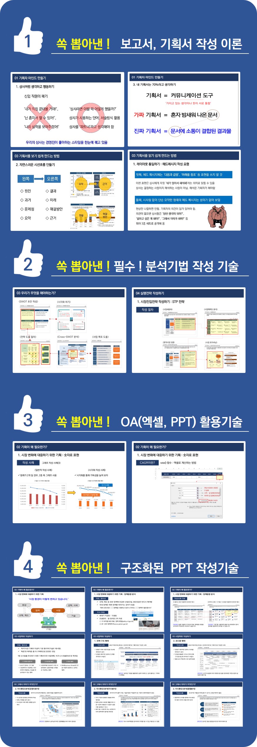 어려운 기획서 이론, 방법론, 구조화, OA 활용 기술은 가라! 기획서를 작성하는데 현업에서 꼭 필요한 실전 지식만 쏙 뽑아 실전 사례를 가지고 강의합니다., 쏙 뽑아낸! 보고서/기획서 작성 원칙