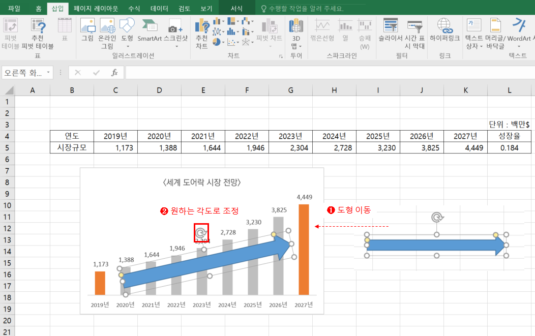 ⑨ 만들어진 도형을 원하는 위치로 이동하고 막대그래프의 추이에 맞게 각도를 조절합니다.