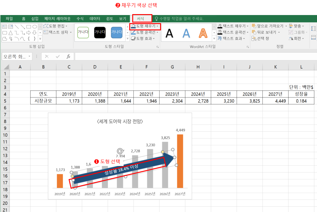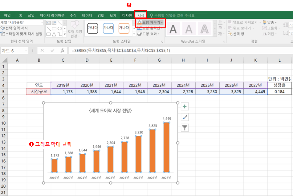 ⑧ 좀 더 그래프의 의미를 부여해 보겠습니다. 다름 아닌 [성장률]이라는 것을 그래프에 삽입하려고 합니다.
