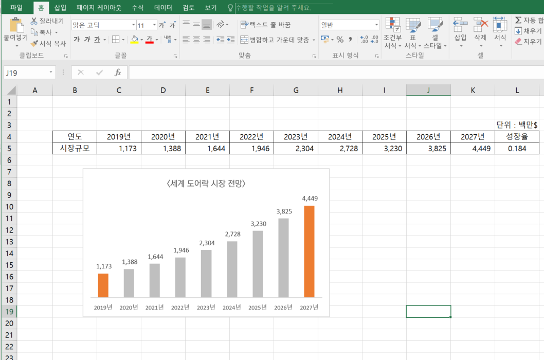시장분석 그래프를 만들 때는 CAGR이란 성장률을 사용하는데 이건 아래 포스팅을 참조하세요
