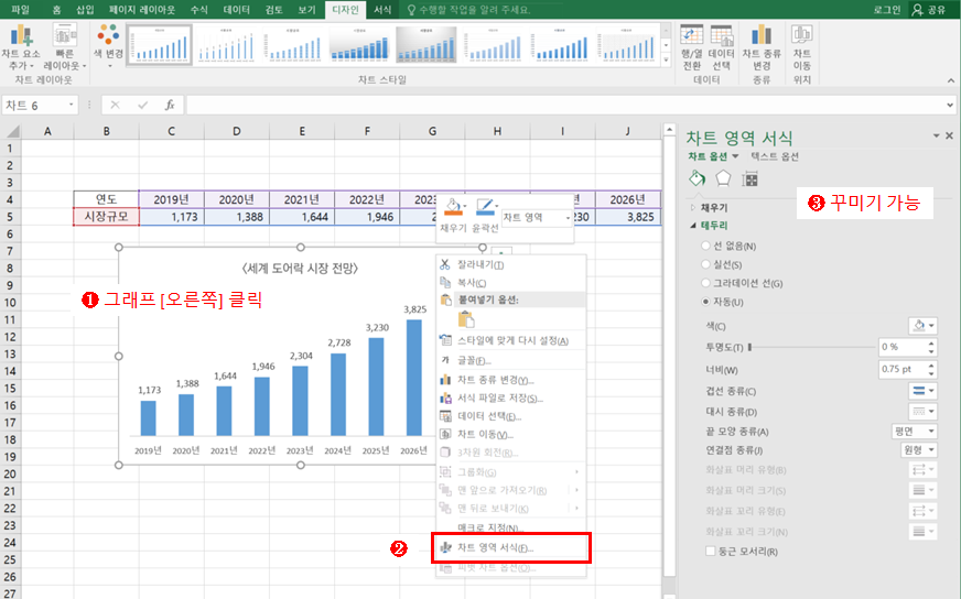 ⑤ 좀 더 그래프를 꾸미고 싶다면 그래프를 오른쪽 클릭한 후, [차트 영역 서식]을 선택하면 채우기, 테두리 등 다양한 형태로 꾸미기가 가능합니다. 오늘은 이런 기능이 있다 정도만 하고 넘어가겠습니다.